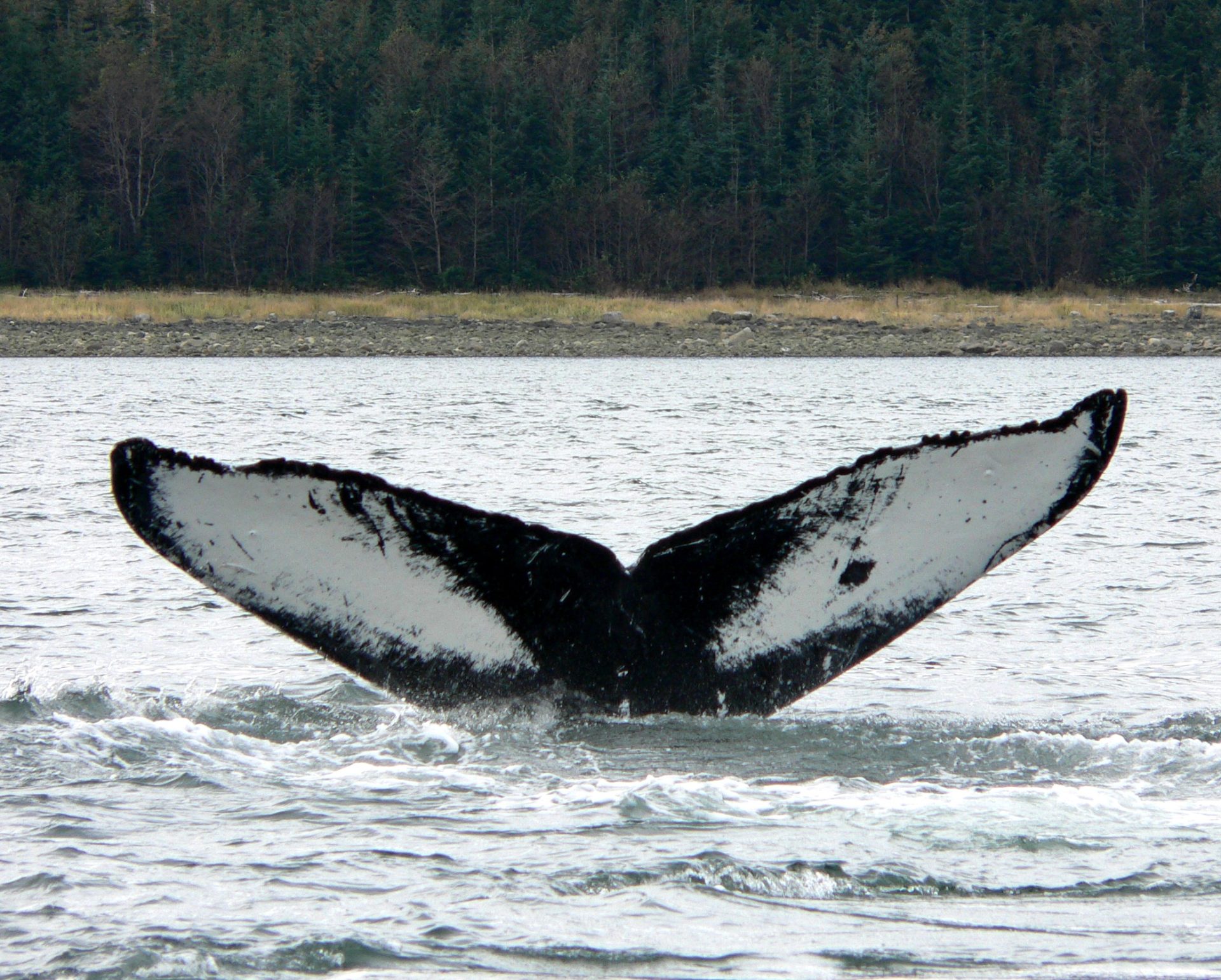 On the underside of each tail there are markings that are unique to each humpback whale. Because each tail is so different the humpback whale community is able to give them names. The markings on this whale are characteristic of the whale named Spot. His official NOAA number is SEAK 1434. He is rumored to be 21 years old. Spot is one of Captain Jayleen’s favorite whales. He has been known to act silly once in a while.