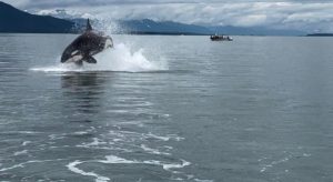 Salty Girl in the far background of a breach Orca – this is an event we hardly ever see — and something that was spotted on this boats first official tour! Needless to say, we think its a ‘lucky’ boat 🙂